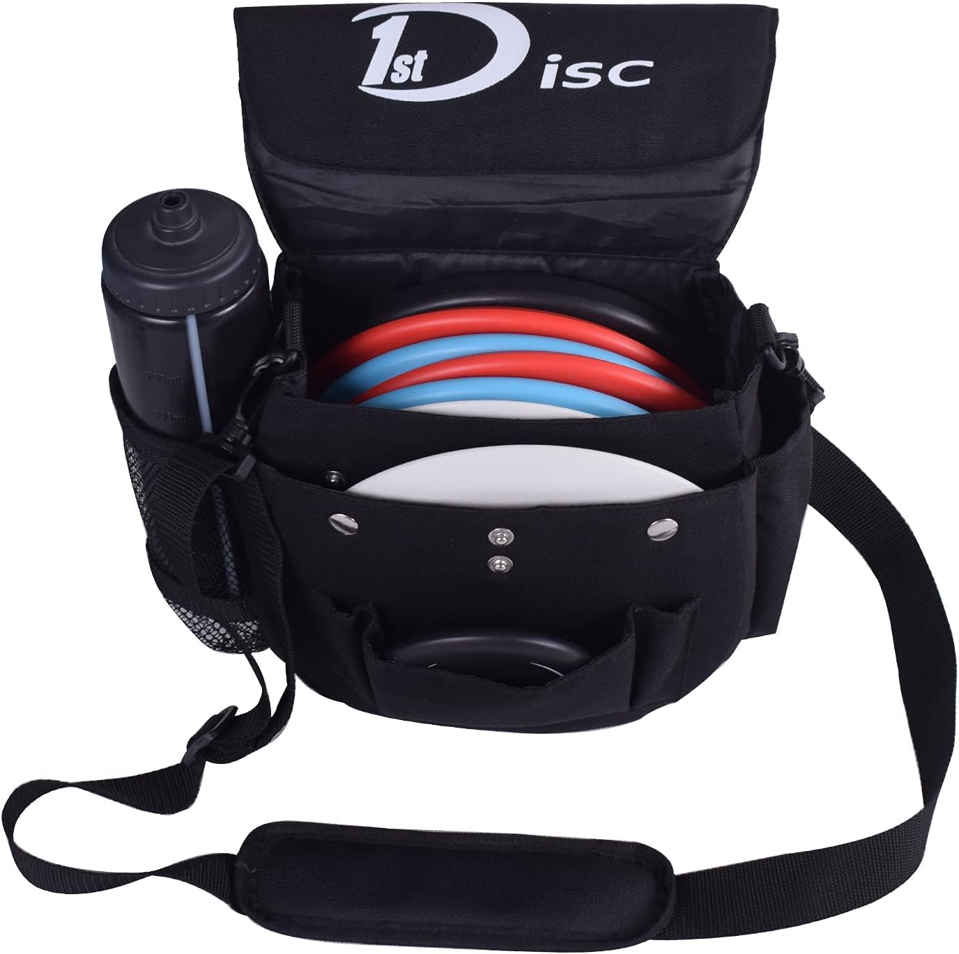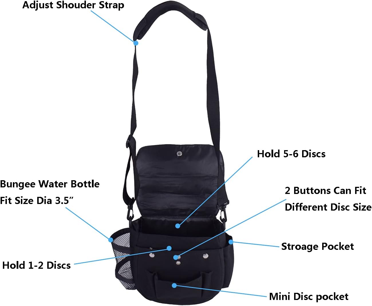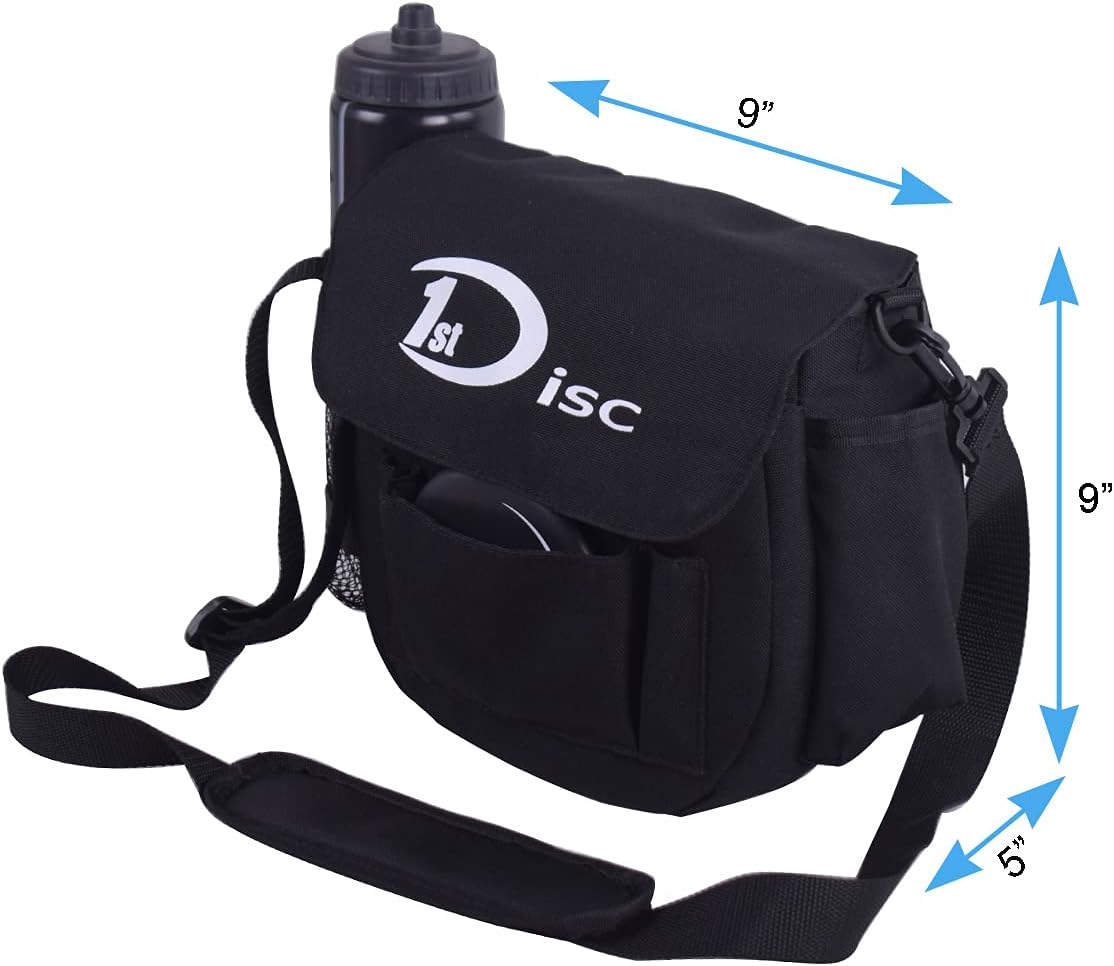 • BAG – Size:9”x5”x9”. The bag included has 6-8 disc capacity, length adjustable shoulder strap, big size fit mesh bottle holder, front pocket for extra discs and Velcro side parts pocket.