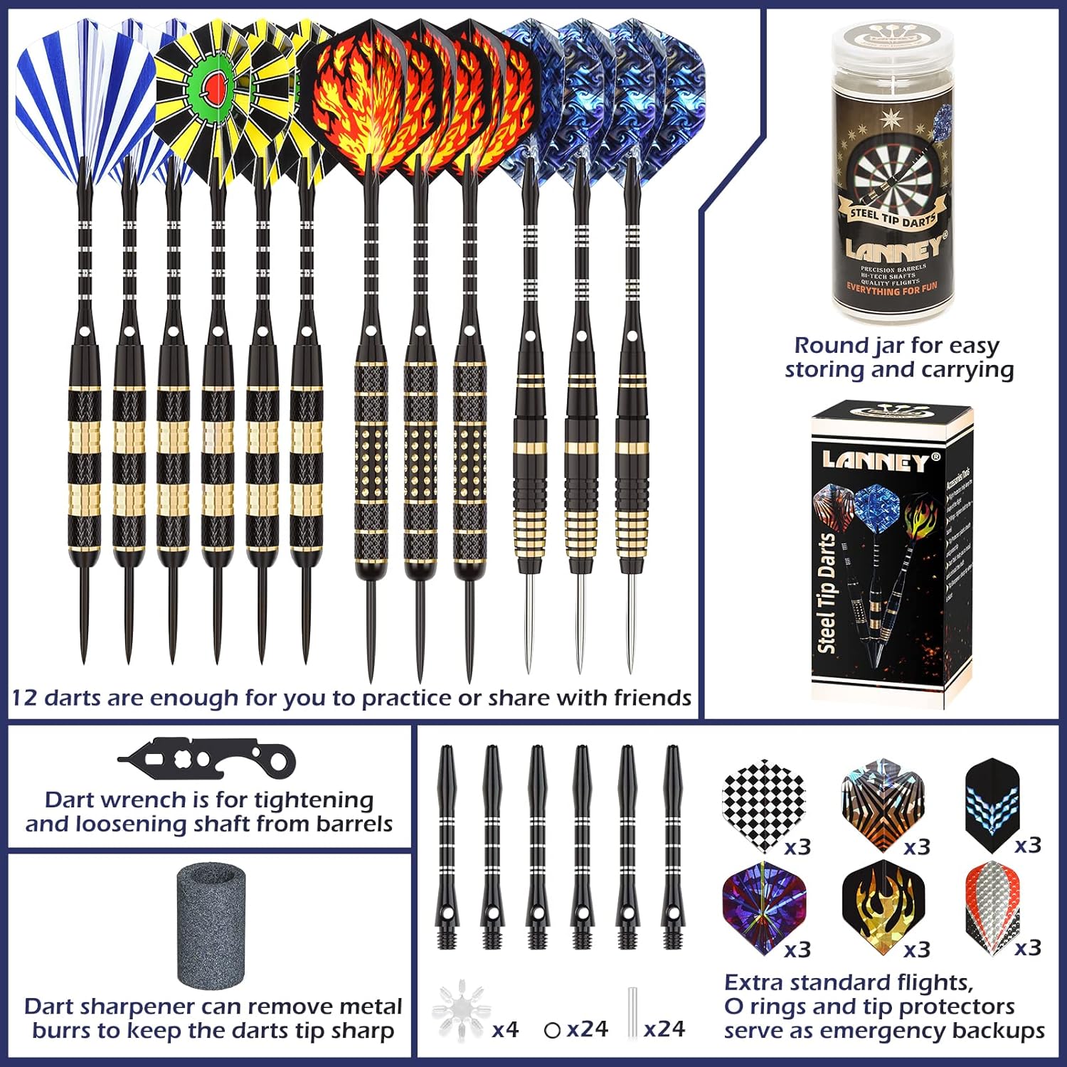 LANNEY Darts Metal Tip Set, Steel Tip Darts Set 20 Grams 24 Grams and 26 Grams Professional Darts for Dartboard with Aluminum Shafts, Brass Barrels, Extra Flights, Sharpener Tool Kit, Carrying Case